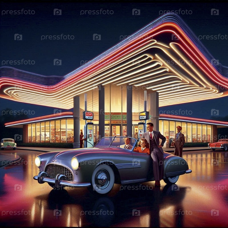 Футуристическая заправочная станция ночью, с освещающимися крыльцами и паром в кабриолете, которые подходят к насосу при помощи униформенного работника, Ai создал изображение