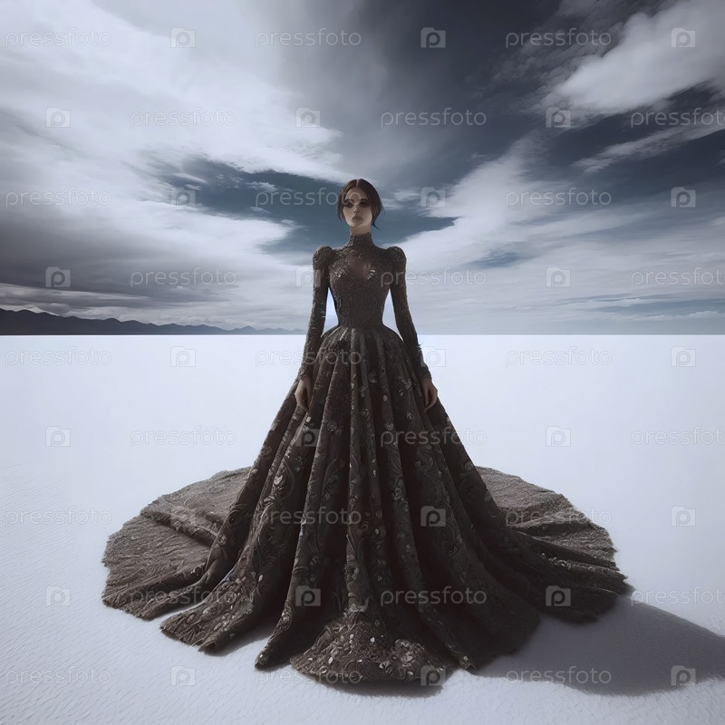 Модная модель в изысканном, текстурированном платье стоит в сюрреалистическом ландшафте белой соляной равнины под обширным, капризным небом