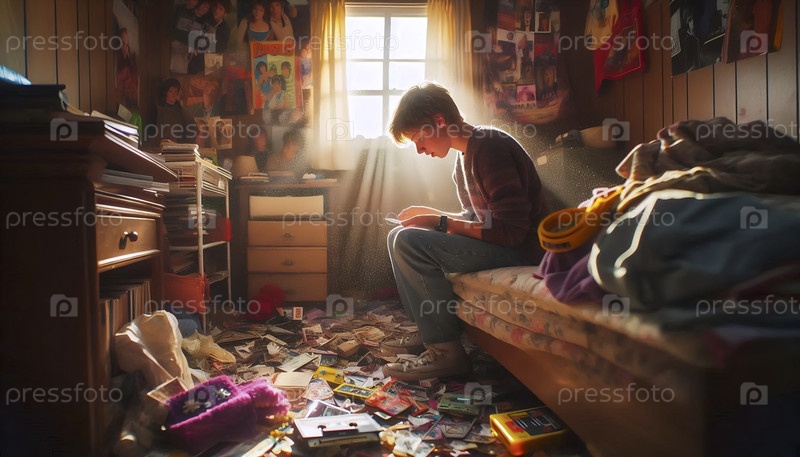 Подростковая беспорядочная спальня в 1980-х годах с плакатами группы на стене и стереоприемником, когда они играют на воздушной гитаре, Ай создала изображение