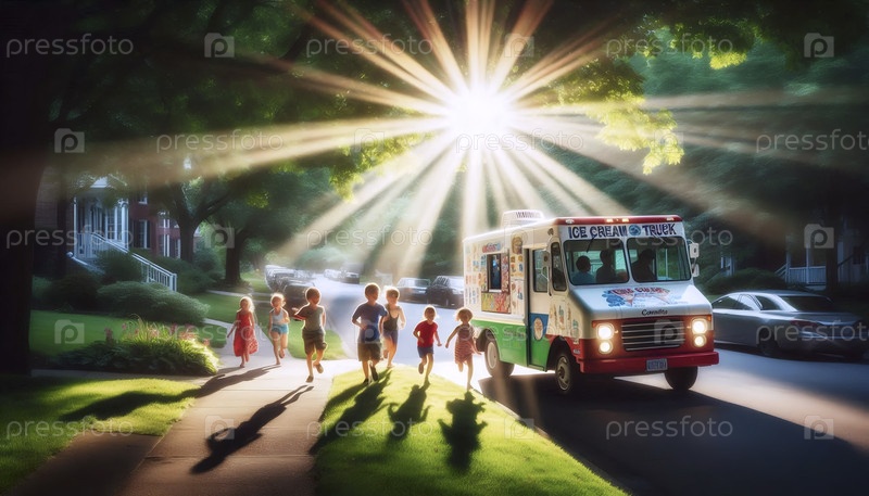 Ежедневная летняя сцена детей, бегущих к грузовику с мороженым на деревянной улице, Ai generated image