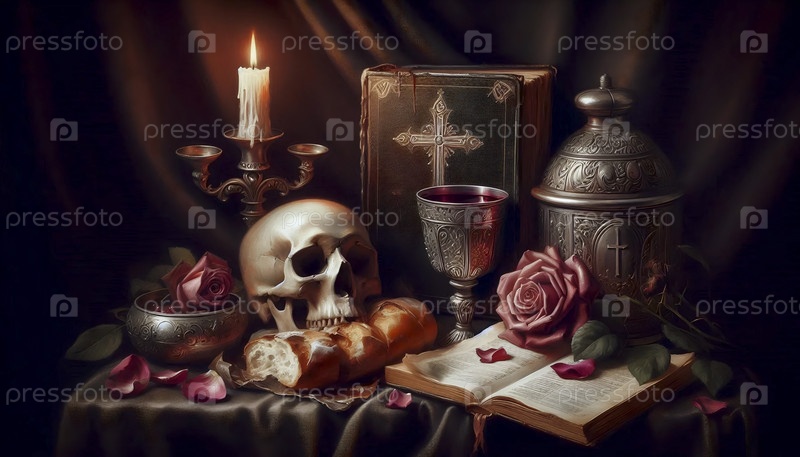 A vanitas sacra натюрморт с черепом и Евхаристией, Ai generated image