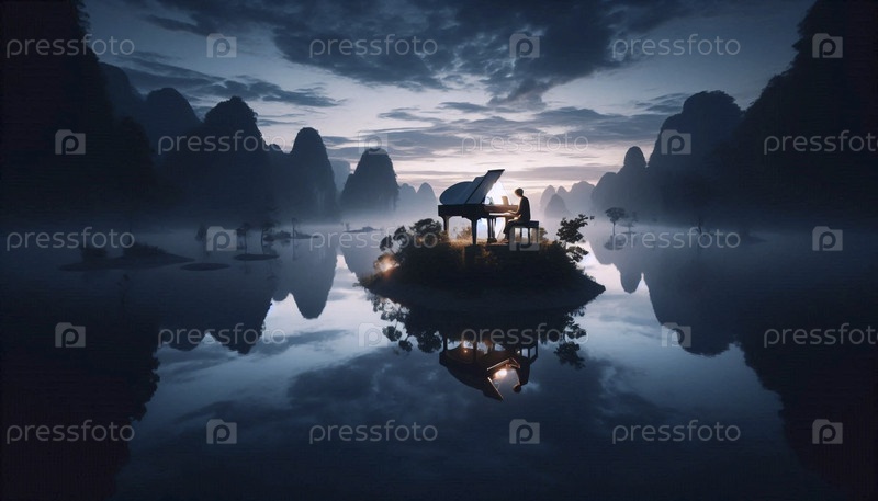 Музыкант играет на фортепиано, которое было размещено на причале, простирающемся в тихое море при закате с появлением первых звезд