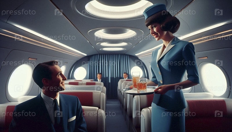 Гламурная стюардесса предлагает бизнесмену коктейль в просторной ретро-футуристической кабине самолета, Ai generated image