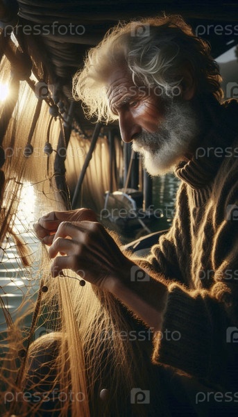 Измученный рыбак исправляет свои сети поздним дневным светом на деревянной доке, Ai generated image