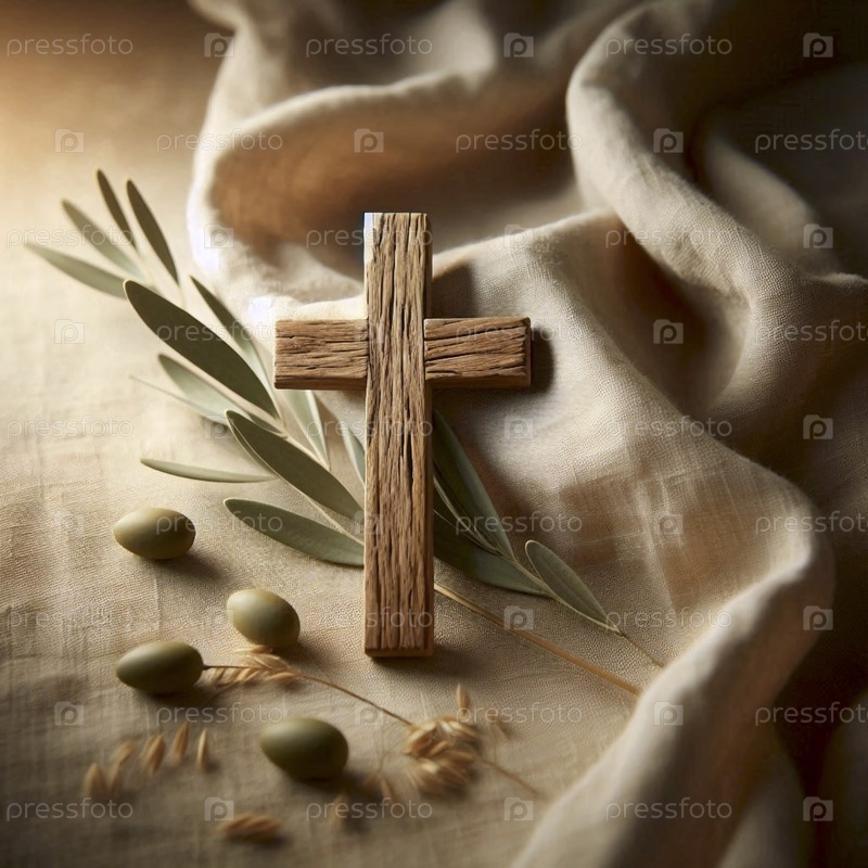 Минимальный крест из оливковых ветвей на льне, Ai generated image
