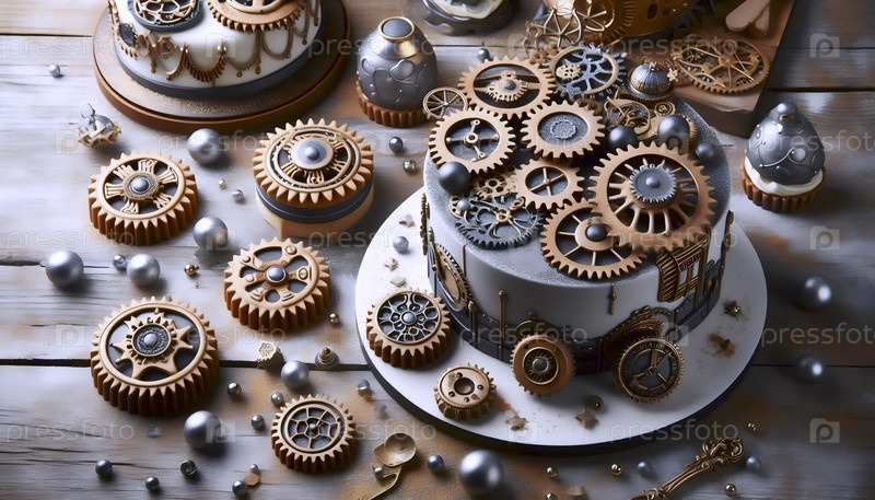 Дисертационное искусство, вдохновленное стемпанком с использованием печенья в форме коробки передач и тортов с металлической пылью, Ai created image