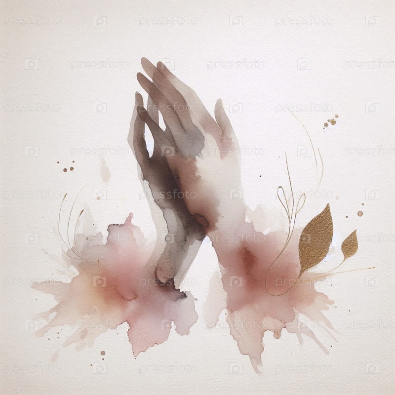 Силуэт двух открытых рук с цветами акварели, Ai generated image