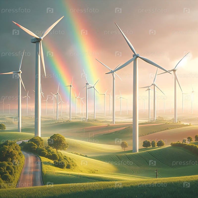 Ветряные турбины на зеленом поле с радугой в фоне, мирная атмосфера