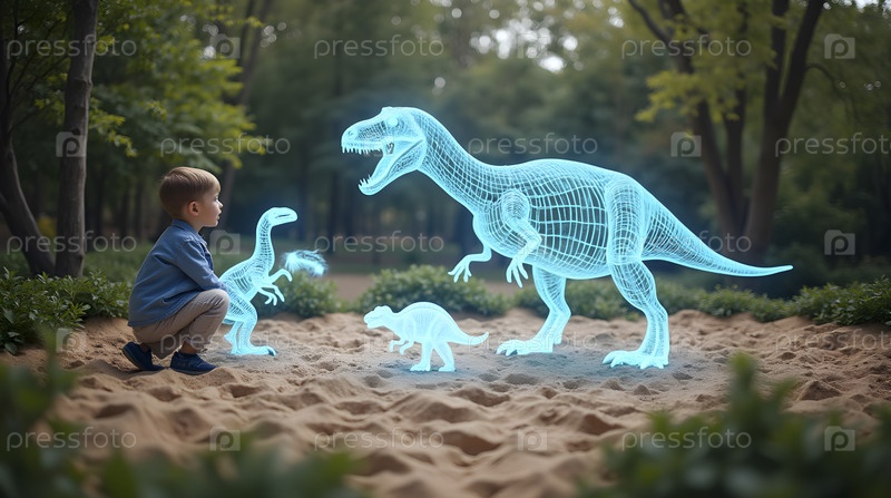 Игровая площадка дополненной реальности, где дети взаимодействуют с голографическими динозаврами, изображение, созданное искусственным интеллектом