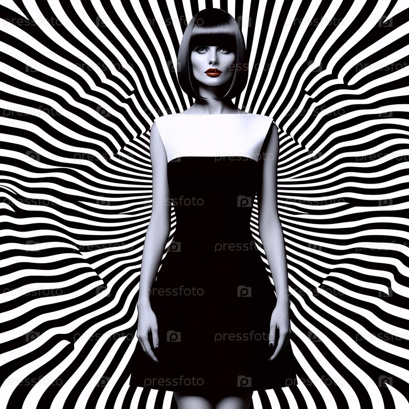 Динамическая реклама моды Op-Art с моделью в модельном платье на фоне пульсирующих черно-белых концентрических кругов, Ai создала изображение
