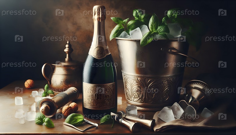 Бутылка шампанского с металлической этикеткой, изображение создано AI