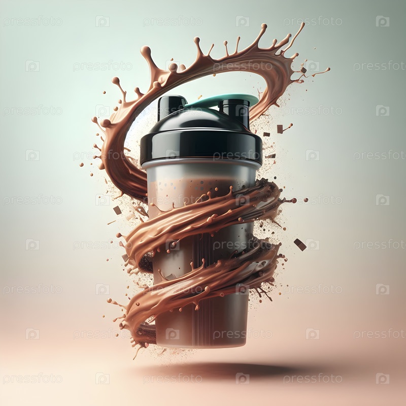 Изолированная прозрачная бутылка для шейкеров с вращающимся шоколадным белковым напитком, Ai created image