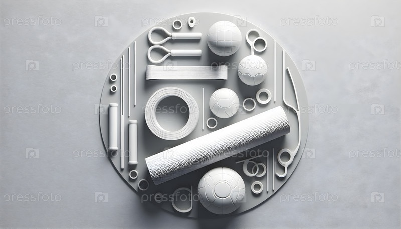 Минималистическое белое спортивное оборудование: резистентные полосы, матрас для йоги и ролик из пены, Ai created image