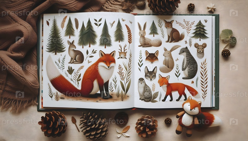 Иллюстрированная детская книга о животных, открытая на странице с лесными существами, Ai created image