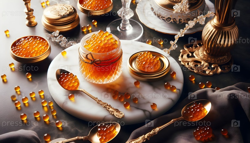 Банка из икры с золотой ложкой, Изображение создано AI
