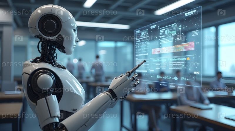 Робот-учитель в высокотехнологичном классе с голографическими дисплеями, Ай создал изображение