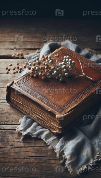 Закрытая антикварная книга с высушенной ластовой ветвью закладки, Ai generated image