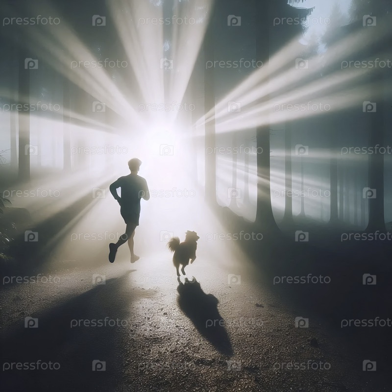 Женщина, бегущая со своей собакой по лесной тропе, окутанной густым эфирным утренним туманом с лучами солнца, фильтрующимися через навес