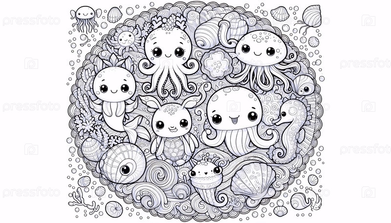 A kawaii ocean creatures цветная страница в круговом формате, Ai generated image