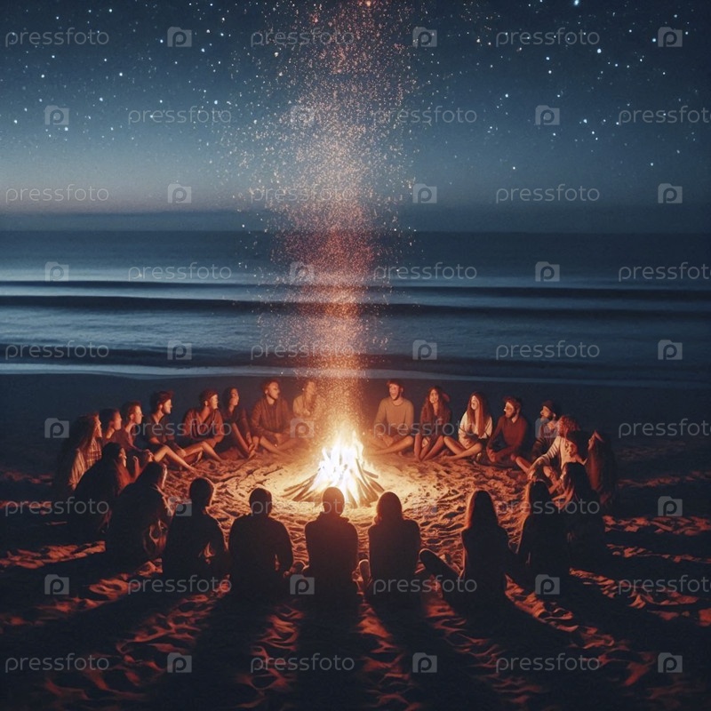 Группа друзей собралась вокруг трескающего костра на темном, отдаленном пляже, их лица были освещены пламенем под звездным небом