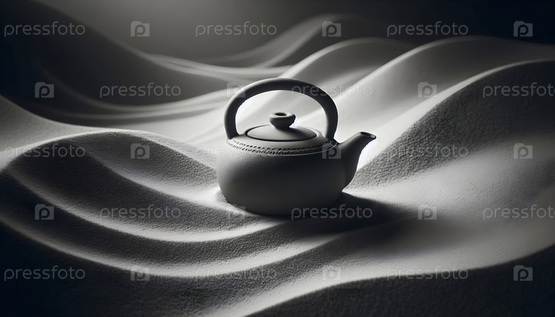 Каменный чайник, расположенный в саду с сухим песком, Aiware created image