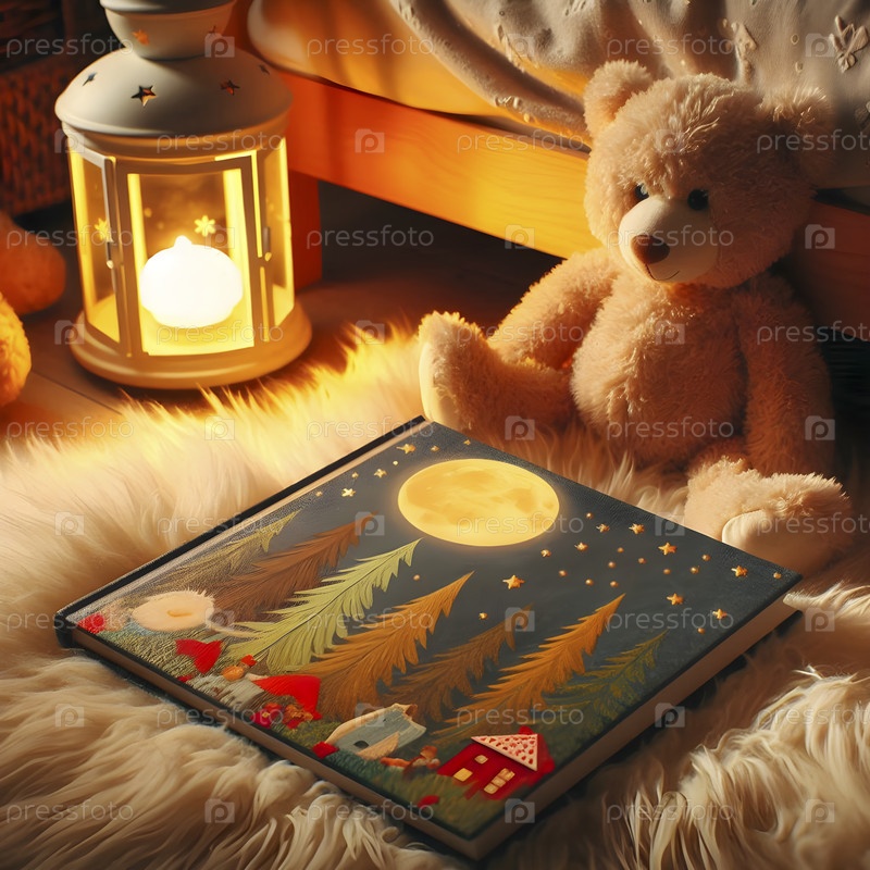 Книга сказок для сна в жесткой обложке на пушистом ковре, с ночным светом и плюшевым животным поблизости, Ай создал изображение