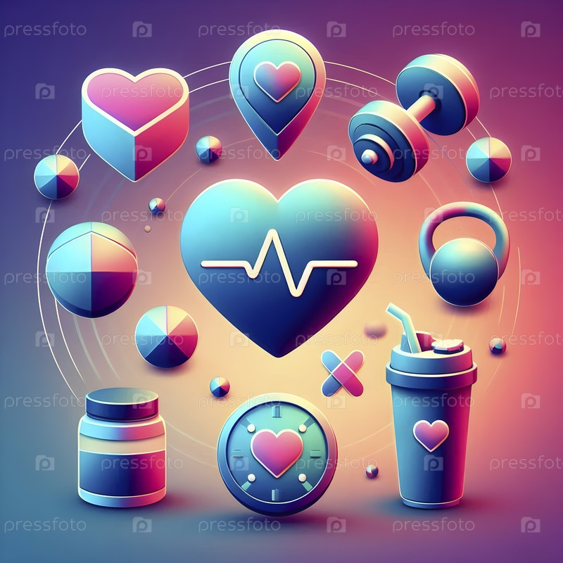 Плавучие фитнес-иконы, гантели, частота сердечных сокращений, протеиновый шейк, Ai created image