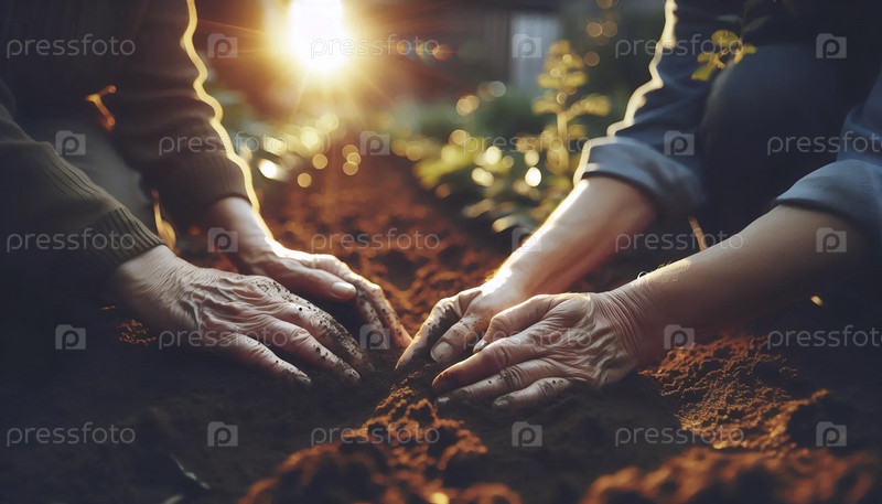 Бабушка и дедушка учат ребенка сажать семена в сад, поздний вечерний свет, Ai generated image