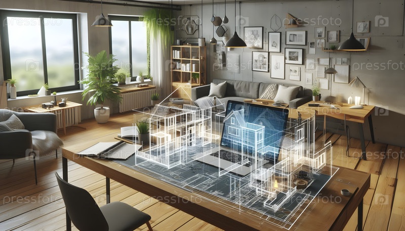 Домашний офис, где поверхность рабочего стола превращается в интерактивный 3D-проект, Ai created image