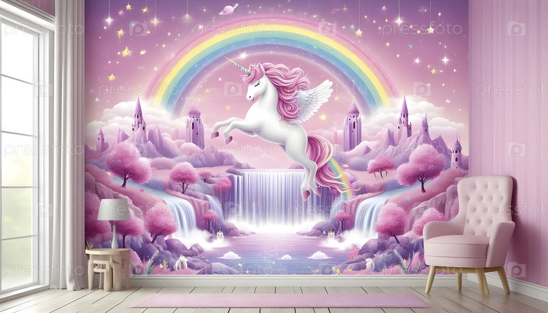 Magical unicorn kingdom детская комната обои с радужными водопадами и блестящей звездой , Ai created image