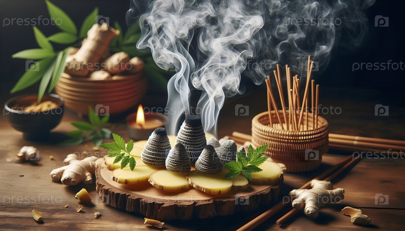 Японское моксибустионное сжигание на кусочках имбиря, Ai created image