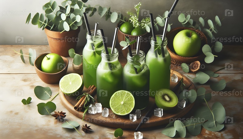 Органические зеленые детоксикационные соки в переработанных бутылках со стержнями из нержавеющей стали, Ai created image