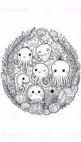 A kawaii ocean creatures цветная страница в круговом формате, Ai generated image