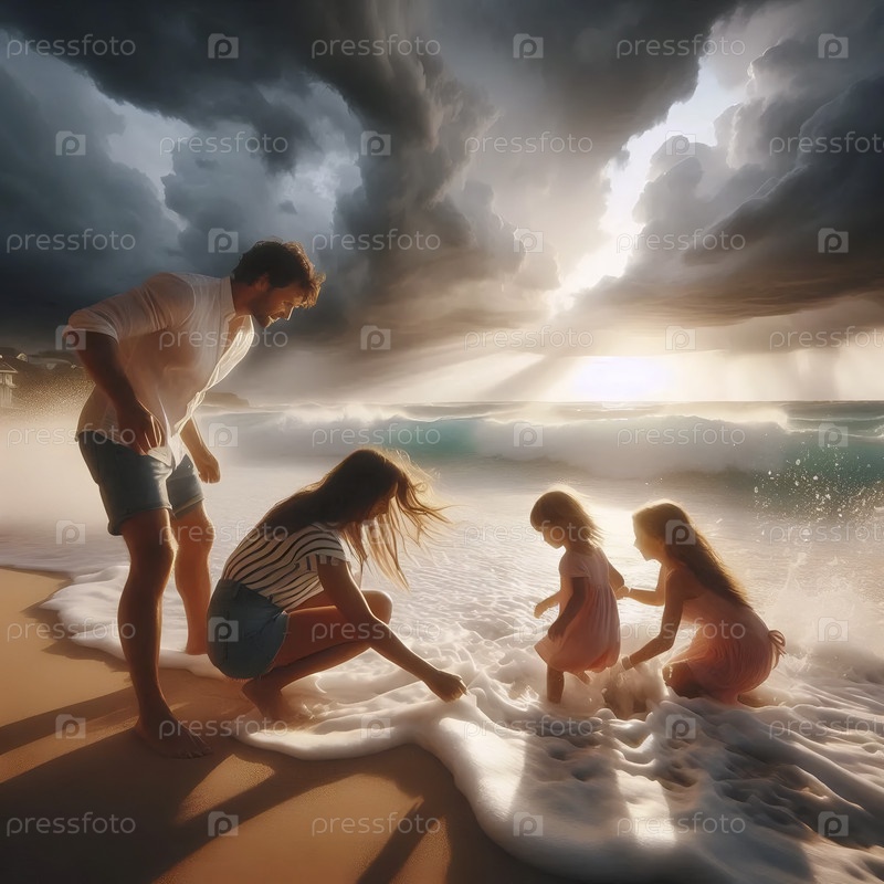 Молодая семья строит песчаный замок вместе на раздуваемом ветром пляже в конце бурного дня, драматическое просветление неба позади них