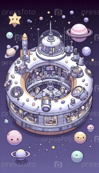 Подробная иллюстрация чиби крошечной космической станции, Ai generated image