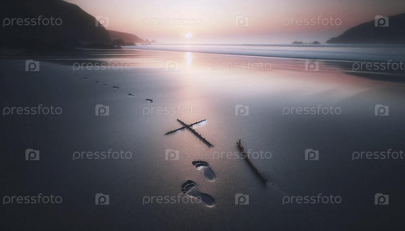 Простой крест, нарисованный в песке с отпечатками ног, ведущими в сторону, Ай создал изображение