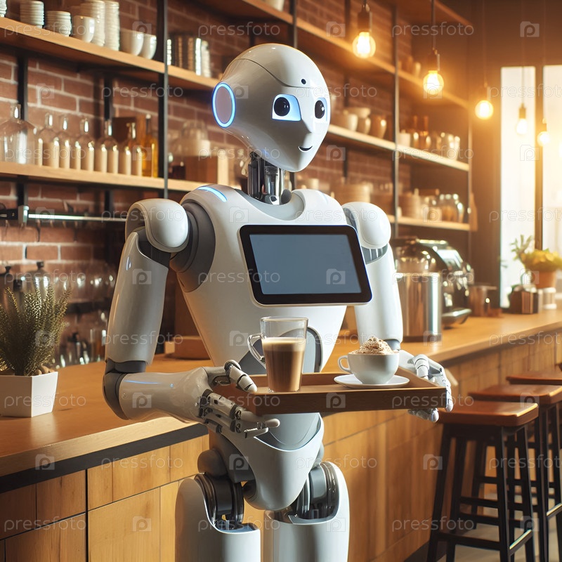 Дружелюбный гуманоидный робот, подающий кофе в современном кафе, теплое освещение, реалистичный