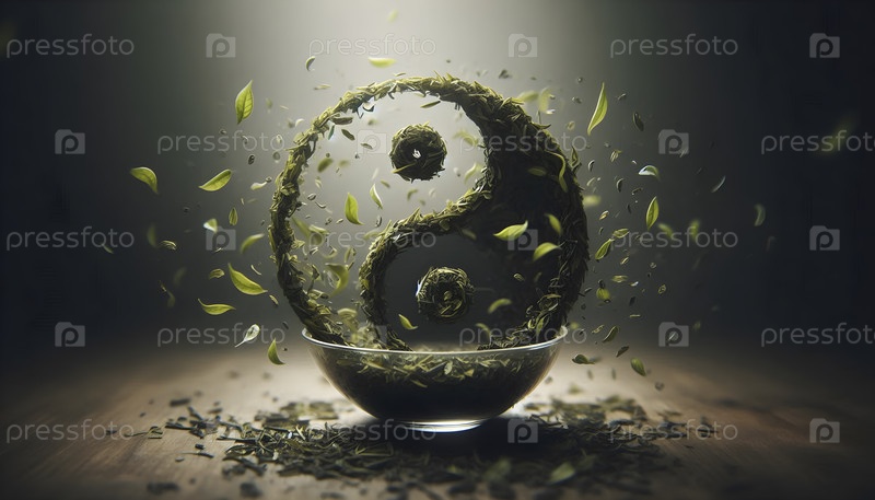 Плавучие чайные листья образуют символ инь-ян, Ai created image