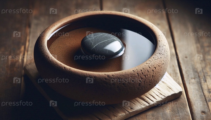 Гладкий камень в маленькой глиняной чашке с водой, Ai generated image