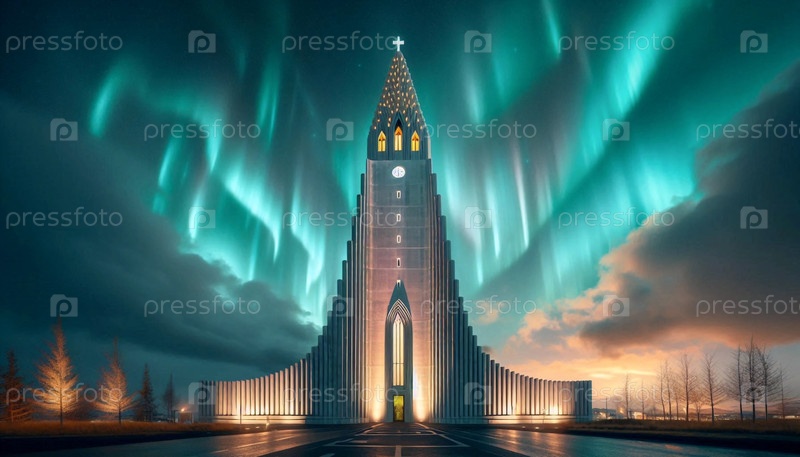 Northern Lights over Hallgrimskirkja, Ai generated image Северное сияние над Халлгримскиркью, Ай создано изображение