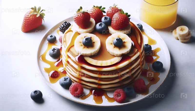 Причудливый стек блинов, украшенный ягодными лицами и улыбками на кусочках бананов, посыпанный сиропом в художественных узорах, Ai created image