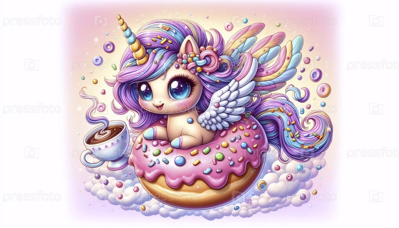 Подробная иллюстрация кавайи пончик-единорог, Ai generated image