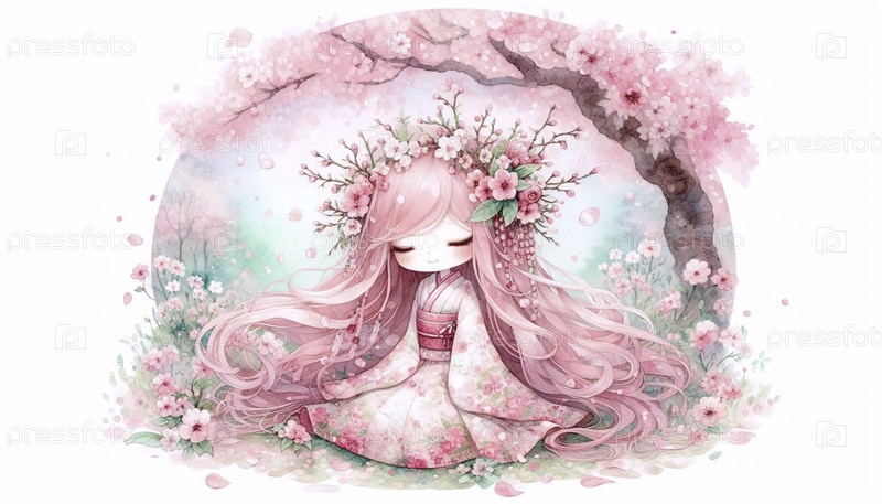 Кавайская сцена девушки, цветущей в вишневом цвете весной, Ai generated image