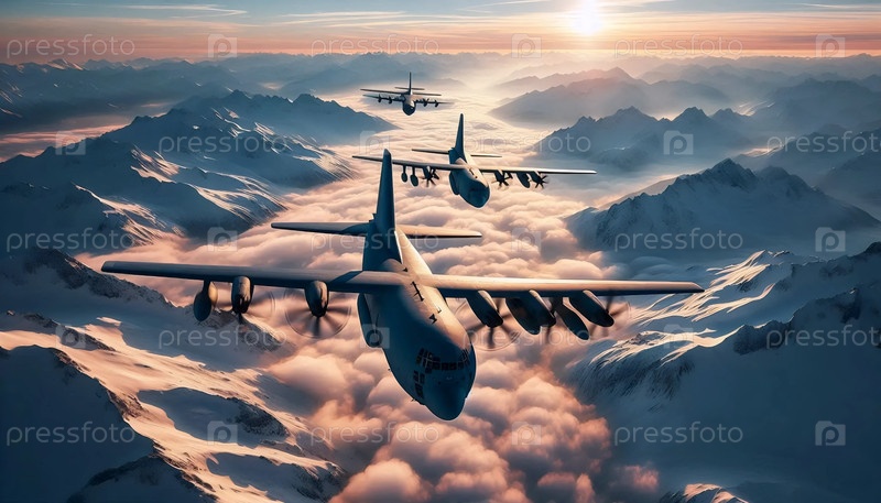 Формирование военно-транспортных самолетов, летящих над горами, Ai generated image