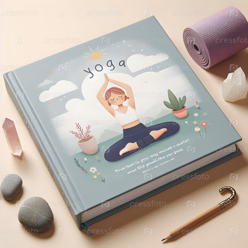 Детская йога книга открыта для иллюстрации позы, с небольшим матом йоги и кристаллом рядом, Ай создала изображение