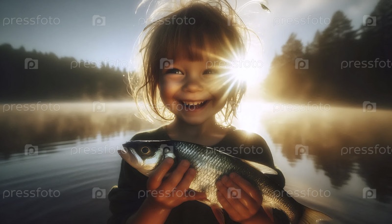 Ребенок гордо держит большую, только что пойманную рыбу на берегу озера с ранним утренним солнцем позади себя