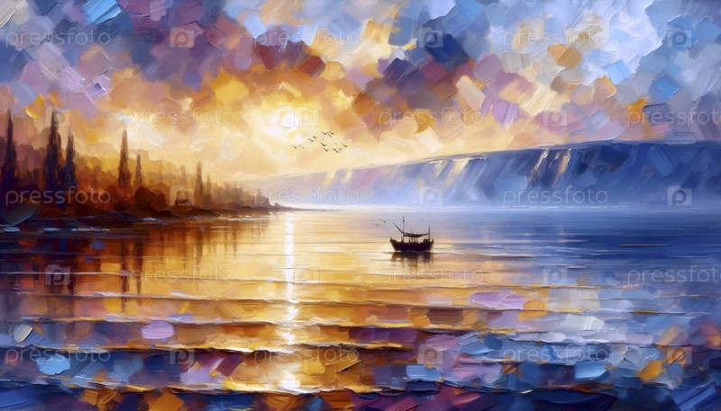 Галилейское море в золотое время, импрессионистский стиль, Ai generated image