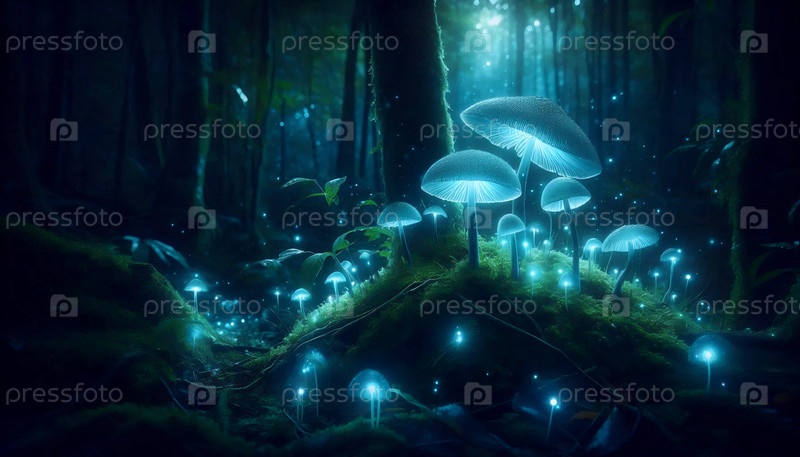 Светящийся биолюминесцентный кластер грибов, Ai generated image