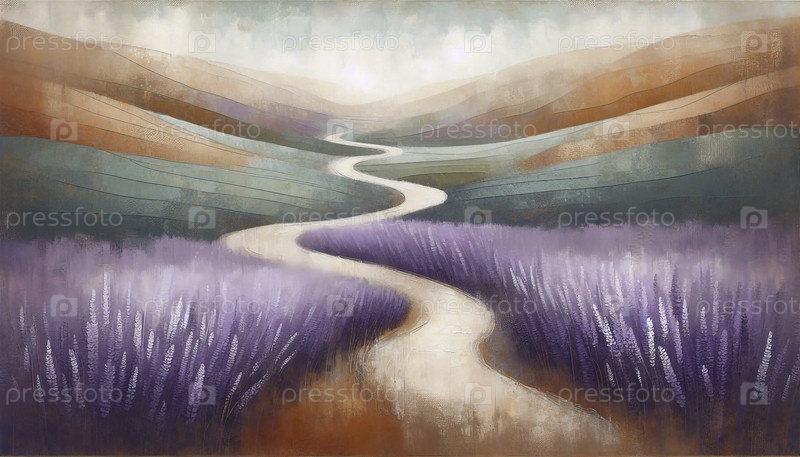 Извилистый путь через поля лаванды абстрактный, Ai generated image