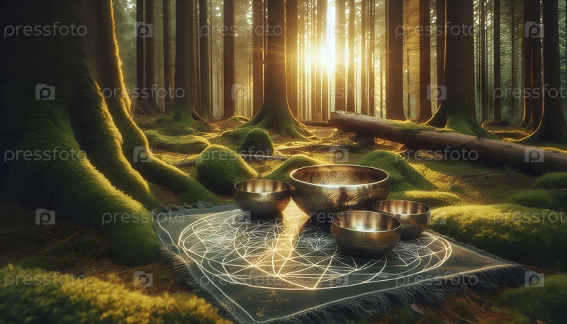 Кристальная решетка и певческая чаша на йога-матке в моховом лесу, Ai created image